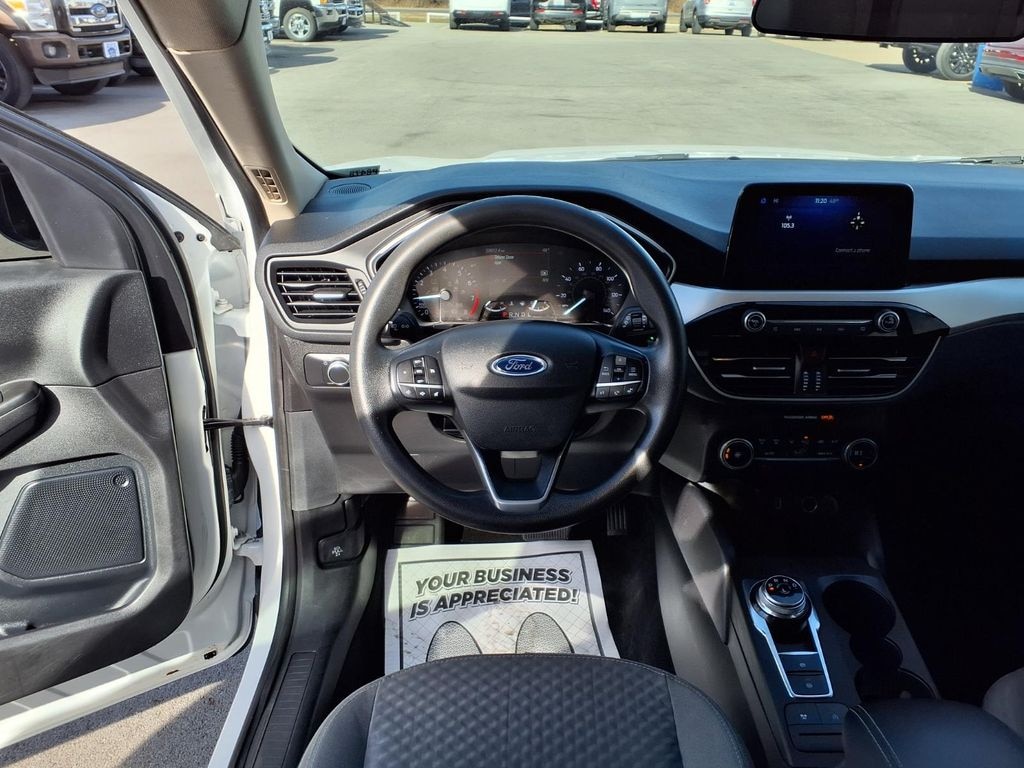 This 2020 Ford Escape SE in Oxford White comes with the following features: 1.5L EcoBoost 8-Speed Automatic AWD AWD Equipment Group 200A, AWD, 3.81 axle ratio, 4-Wheel Disc Brakes, 6 Speakers, ABS brakes, Air Conditioning, Alloy wheels, AM/FM radio: SiriusXM, AM/FM Stereo, Auto High-beam Headlights, Automatic temperature control, Brake assist, Bumpers: body-color, Compass, Delay-off headlights, Driver door bin, Driver vanity mirror, Dual front impact airbags, Dual front side impact airbags, Electronic Stability Control, Emergency communication system: SYNC 3 911 Assist, Exterior Parking Camera Rear, FordPass Connect, Four wheel independent suspension, Front anti-roll bar, Front Bucket Seats, Front Center Armrest, Front reading lights, Fully automatic headlights, Heated door mirrors, Heated front seats, Heated Unique Cloth Front Bucket Seats, Illuminated entry, Knee airbag, Low tire pressure warning, Occupant sensing airbag, Outside temperature display, Overhead airbag, Overhead console, Panic alarm, Passenger door bin, Passenger vanity mirror, Power door mirrors, Power driver seat, Power steering, Power windows, Radio data system, Rear anti-roll bar, Rear reading lights, Rear seat center armrest, Rear window defroster, Rear window wiper, Remote keyless entry, Speed control, Speed-sensing steering, Speed-Sensitive Wipers, Split folding rear seat, Spoiler, Steering wheel mounted audio controls, SYNC 3 Communications & Entertainment System, Tachometer, Telescoping steering wheel, Tilt steering wheel, Traction control, Trip computer, Variably intermittent wipers, and Wheels: 17" Shadow Silver-Painted Aluminum. Oxford White 2020 Ford Escape SE AWD 8-Speed Automatic 1.5L EcoBoost AWD.