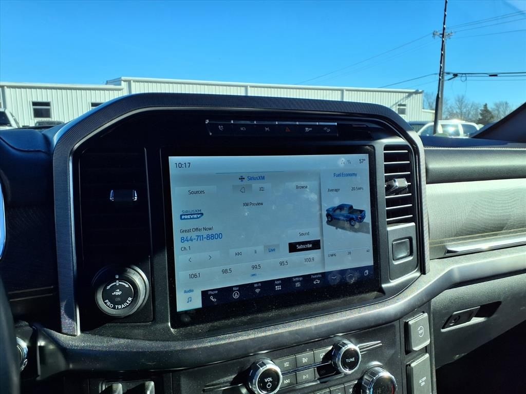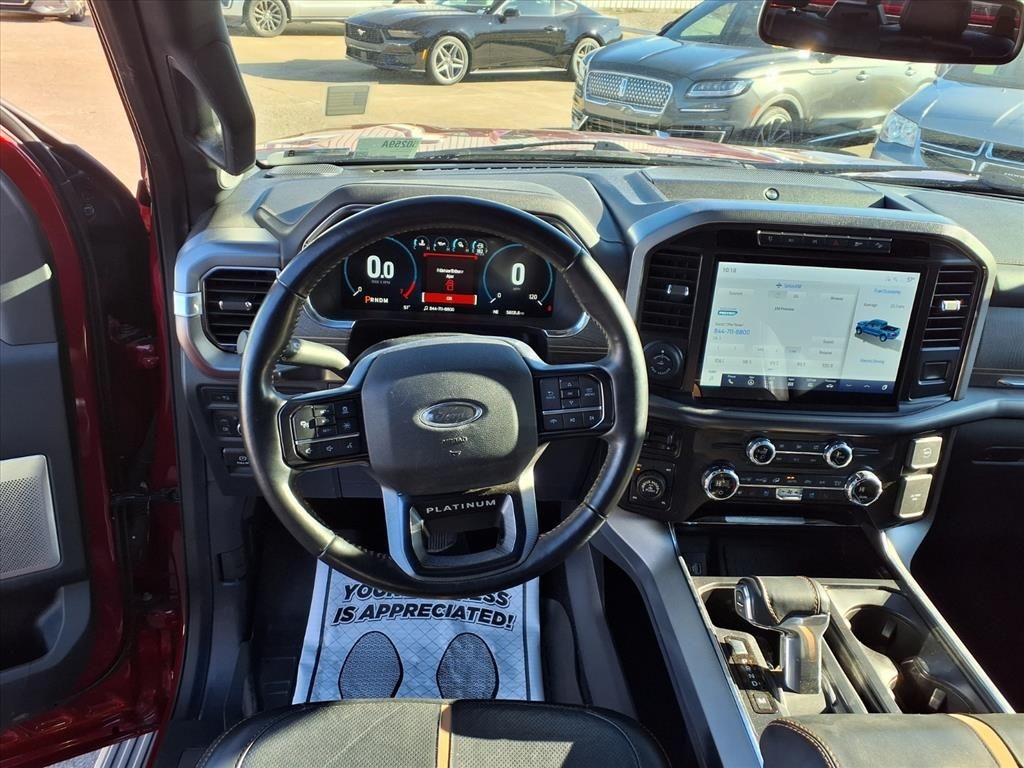 This 2021 Ford F-150 Platinum in Red comes with the following features: 3.5L PowerBoost Full-Hybrid V6 10-Speed Automatic 4WD 3.5L PowerBoost Full-Hybrid V6 and 4WD Equipment Group 701A High (Power Tailgate and Radio: B&O Unleashed Sound System by Bang & Olufsen), Ford Co-Pilot360 Active 2.0 Package (Active Park Assist 2.0 and BlueCruise Hands-Free Driving), FX4 Off-Road Package (4x4 FX4 Off-Road Bodyside Decal, Hill Descent Control, Monotube Rear Shocks, Off-Road Tuned Front Shock Absorbers, Rock Crawl Mode, and Tray Style Floor Liner), Max Trailer Tow Package (Class IV Trailer Hitch Receiver, Extended Range 36 Gallon Fuel Tank, Integrated Trailer Brake Controller, and Pro Trailer Backup Assist), Tow Technology Package (360 Degree Camera), 3.5L PowerBoost Full-Hybrid V6, 4WD, 20" Polished Aluminum Wheels, 4-Wheel Disc Brakes, 8 Speakers, ABS brakes, Adaptive Steering, Adjustable pedals, Air Conditioning, Alloy wheels, AM/FM radio: SiriusXM with 360L, Auto High-beam Headlights, Auto tilt-away steering wheel, Auto-dimming door mirrors, Auto-dimming Rear-View mirror, Automatic temperature control, Brake assist, Bumpers: body-color, Compass, Delay-off headlights, Driver door bin, Driver vanity mirror, Dual front impact airbags, Dual front side impact airbags, Electronic Stability Control, Emergency communication system: SYNC 4 911 Assist, Exterior Parking Camera Rear, Front anti-roll bar, Front Bucket Seats, Front Center Armrest, Front dual zone A/C, Front fog lights, Front reading lights, Front wheel independent suspension, Fully automatic headlights, Garage door transmitter, Heated door mirrors, Heated front seats, Heated rear seats, Heated steering wheel, Illuminated entry, LED Sideview Mirror Spotlights, Low tire pressure warning, Memory seat, Navigation system: Connected Navigation (90-Day Trial), Occupant sensing airbag, Outside temperature display, Overhead airbag, Overhead console, Panic alarm, Passenger door bin, Passenger vanity mirror, Pedal memory, Power door mirrors, Power driver seat, Power passenger seat, Power steering, Power windows, Pro Power Onboard - 7.2KW, Radio data system, Radio: B&O Sound System by Bang & Olufsen, Rain sensing wipers, Rear reading lights, Rear seat center armrest, Rear step bumper, Rear window defroster, Remote keyless entry, Security system, Speed control, Speed-sensing steering, Split folding rear seat, Steering wheel memory, Steering wheel mounted audio controls, SYNC 4 w/Enhanced Voice Recognition, Tachometer, Telescoping steering wheel, Tilt steering wheel, Traction control, Trip computer, Turn signal indicator mirrors, Twin Panel Moonroof, Unique Multi-Contour Leather Bucket Seats, Variably intermittent wipers, Ventilated front seats, and Voltmeter. Red 2021 Ford F-150 Platinum 4WD 10-Speed Automatic 3.5L PowerBoost Full-Hybrid V6 3.5L PowerBoost Full-Hybrid V6, 4WD.