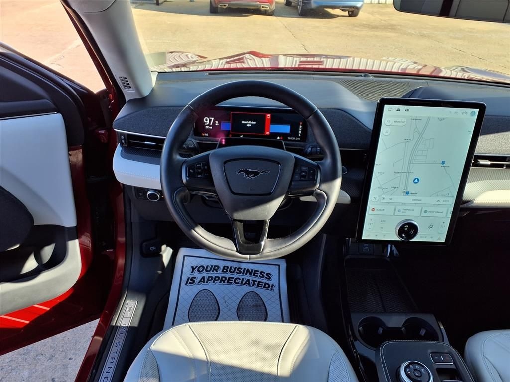 This 2022 Ford Mustang Mach-E Premium in Red Metallic comes with the following features: Electric Motor Single-Speed Automatic RWD Equipment Group 300A, 10 Speakers, 4-Wheel Disc Brakes, ABS brakes, Active Park Assist Prep Kit, Air Conditioning, Alloy wheels, AM/FM radio: SiriusXM with 360L, AM/FM Stereo, Apple CarPlay/Android Auto, Auto High-beam Headlights, Auto-dimming Rear-View mirror, Automatic temperature control, Axle Ratio: 9.05, Brake assist, Bumpers: body-color, Compass, Delay-off headlights, Driver door bin, Driver vanity mirror, Dual front impact airbags, Dual front side impact airbags, Electronic Stability Control, Emergency communication system: 911 Assist, Exterior Parking Camera Rear, Four wheel independent suspension, Front anti-roll bar, Front Bucket Seats, Front Center Armrest, Front dual zone A/C, Front reading lights, Fully automatic headlights, Garage door transmitter, Heated door mirrors, Heated front seats, Heated Perforated ActiveX Bucket Seats, Heated steering wheel, Illuminated entry, Knee airbag, Low tire pressure warning, Memory seat, Navigation system: Connected Navigation, Occupant sensing airbag, Outside temperature display, Overhead airbag, Overhead console, Panic alarm, Passenger door bin, Passenger vanity mirror, Power door mirrors, Power driver seat, Power Liftgate, Power passenger seat, Power steering, Power windows, Radio data system, Rain sensing wipers, Rear anti-roll bar, Rear seat center armrest, Rear side impact airbag, Rear window defroster, Rear window wiper, Remote keyless entry, Security system, SiriusXM Radio w/360L, Speed control, Speed-sensing steering, Speed-Sensitive Wipers, Split folding rear seat, Spoiler, Steering wheel mounted audio controls, SYNC 4A w/Enhanced Voice Recognition, Telescoping steering wheel, Tilt steering wheel, Traction control, Trip computer, Turn signal indicator mirrors, Variably intermittent wipers, and Wheels: 19" Machined-Face Aluminum. Red Metallic 2022 Ford Mustang Mach-E Premium RWD Single-Speed Automatic Electric Motor