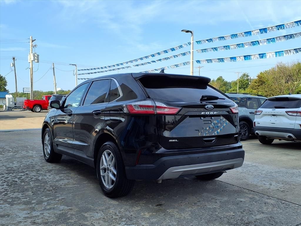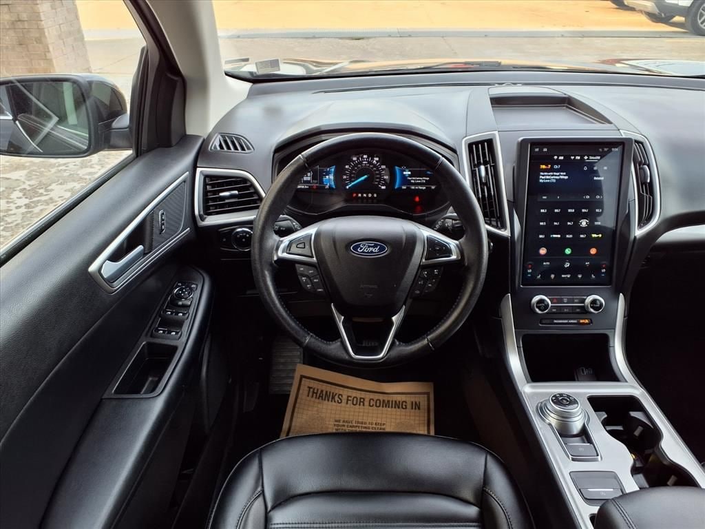 This 2023 Ford Edge SEL in Black Metallic comes with the following features: EcoBoost 2.0L I4 GTDi DOHC Turbocharged VCT 8-Speed Automatic AWD AWD Equipment Group 201A, AWD, 3.80 Axle Ratio, 4-Wheel Disc Brakes, 6 Speakers, ABS brakes, ActiveX Seating Material Heated Bucket Seats, Air Conditioning, Alloy wheels, AM/FM radio: SiriusXM with 360L, Auto High-beam Headlights, Auto-dimming Rear-View mirror, Automatic temperature control, Brake assist, Bumpers: body-color, Compass, Delay-off headlights, Driver door bin, Driver vanity mirror, Dual front impact airbags, Dual front side impact airbags, Electronic Stability Control, Emergency communication system: SYNC 4 911 Assist, FordPass Connect, Four wheel independent suspension, Front anti-roll bar, Front Bucket Seats, Front Center Armrest w/Storage, Front dual zone A/C, Front License Plate Bracket, Front reading lights, Fully automatic headlights, Heated door mirrors, Heated front seats, Illuminated entry, Knee airbag, Leather steering wheel, Leather-Wrapped Steering Wheel, Low tire pressure warning, Occupant sensing airbag, Outside temperature display, Overhead airbag, Overhead console, Panic alarm, Passenger door bin, Passenger vanity mirror, Power door mirrors, Power driver seat, Power passenger seat, Power steering, Power windows, Radio: AM/FM Stereo/MP3 Capable, Rear anti-roll bar, Rear Parking Sensors, Rear reading lights, Rear seat center armrest, Rear window defroster, Rear window wiper, Remote keyless entry, SiriusXM w/360L, Speed control, Speed-Sensitive Wipers, Split folding rear seat, Spoiler, Steering wheel mounted audio controls, SYNC 4A w/Enhanced Voice Recognition, Tachometer, Telescoping steering wheel, Tilt steering wheel, Traction control, Trip computer, Variably intermittent wipers, and Wheels: 18" Sparkle Silver-Painted Aluminum. Black Metallic 2023 Ford Edge SEL AWD 8-Speed Automatic EcoBoost 2.0L I4 GTDi DOHC Turbocharged VCT AWD.