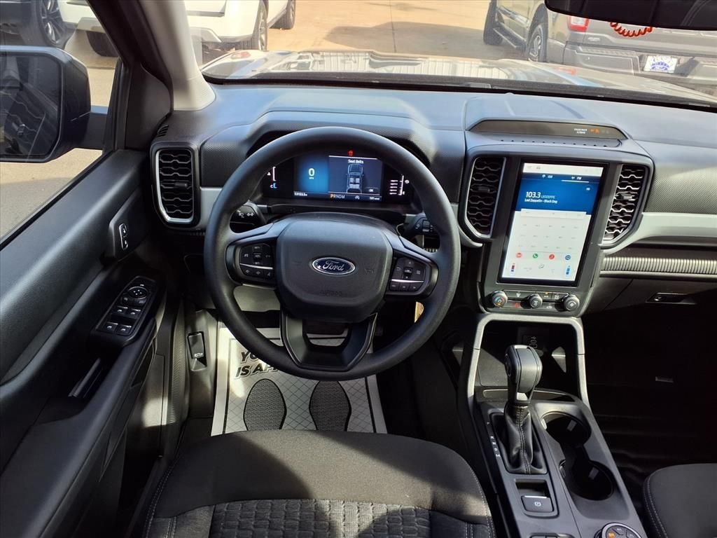 This 2024 Ford Ranger XL in Shadow Black comes with the following features: EcoBoost 2.3L I4 GTDi DOHC Turbocharged VCT 10-Speed Automatic 4WD 4WD Equipment Group 100A Standard, STX Appearance Package (Dampened Tailgate, Halogen Fog Lamps, LED Reflector Headlamps, and STX Fender Badge), Trailer Tow Package (Class IV Trailer Hitch Receiver), 4WD, 3.73 Axle Ratio, 4-Wheel Disc Brakes, 6 Speakers, ABS brakes, Air Conditioning, Alloy wheels, AM/FM radio, AM/FM Stereo, Auto High-beam Headlights, Black Running Boards, Body-Color SecuriCode Keyless Entry Keypad, Brake assist, Bumpers: body-color, Carpet Floor Covering w/Carpet Floor Mats, Compass, Delay-off headlights, Driver door bin, Dual front impact airbags, Dual front side impact airbags, Electronic Stability Control, Emergency communication system: SYNC 4 911 Assist, Front anti-roll bar, Front Bucket Seats, Front Center Armrest, Front fog lights, Front License Plate Bracket, Front reading lights, Front wheel independent suspension, Fully automatic headlights, Illuminated entry, Low tire pressure warning, Occupant sensing airbag, Outside temperature display, Overhead airbag, Overhead console, Panic alarm, Passenger door bin, Power door mirrors, Power steering, Power windows, Premium Cloth Front Bucket Seats, Rear reading lights, Rear seat center armrest, Rear step bumper, Remote keyless entry, Security system, Speed control, Speed-sensing steering, Steering wheel mounted audio controls, SYNC 4A, Telescoping steering wheel, Tilt steering wheel, Traction control, Trip computer, Variably intermittent wipers, Voltmeter, and Wheels: 17" Silver-Painted Aluminum. Shadow Black 2024 Ford Ranger XL 4WD 10-Speed Automatic EcoBoost 2.3L I4 GTDi DOHC Turbocharged VCT 4WD.