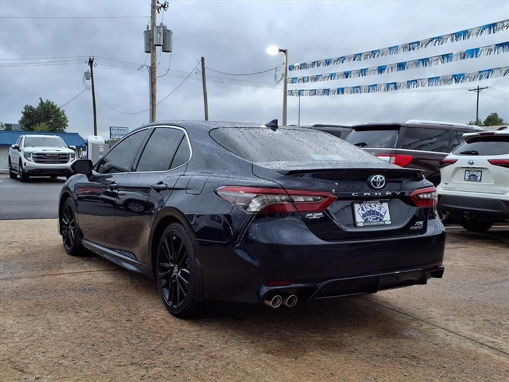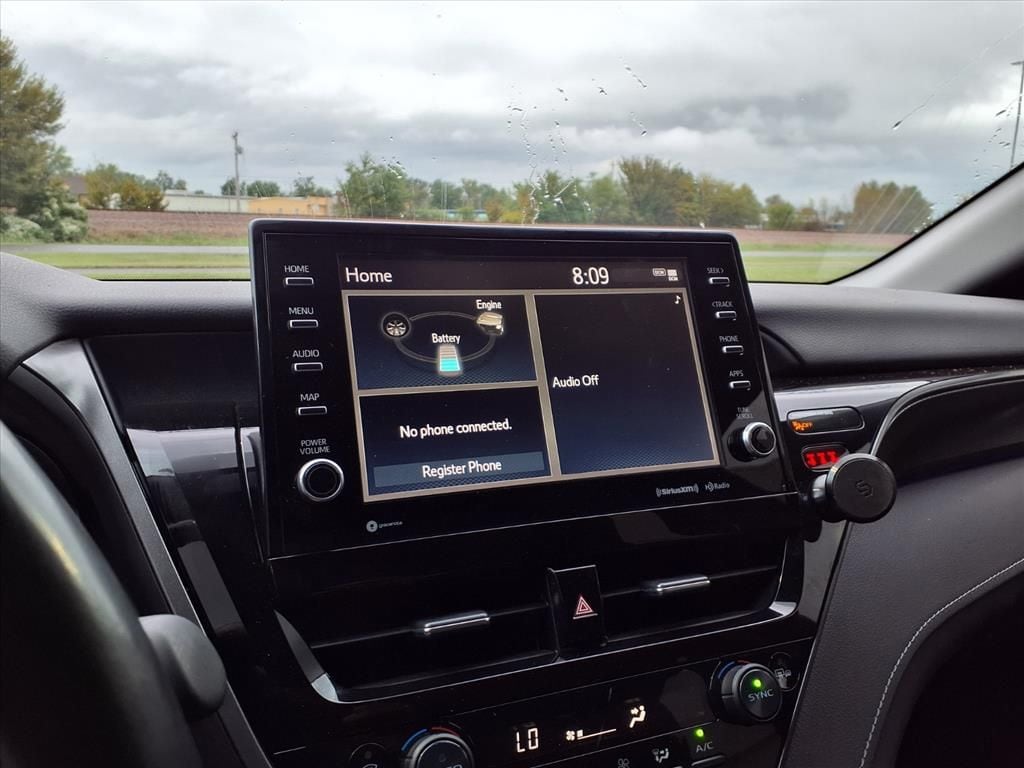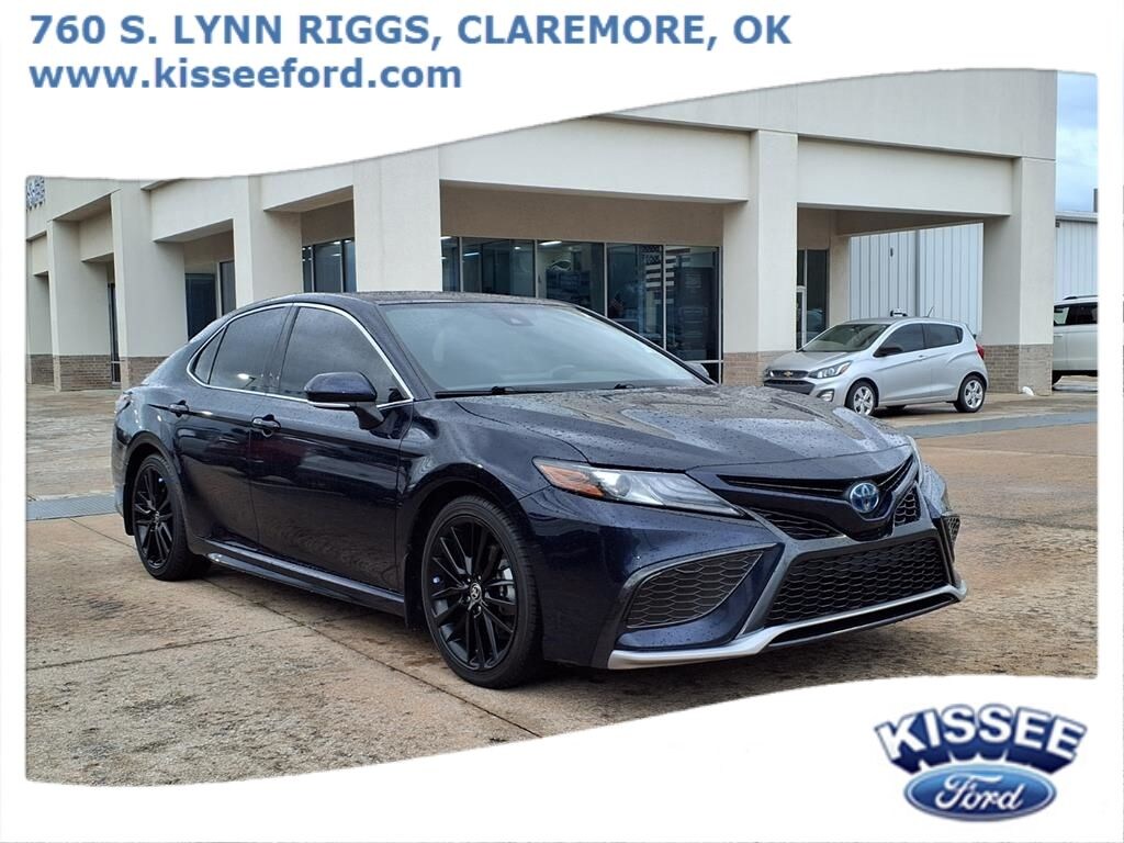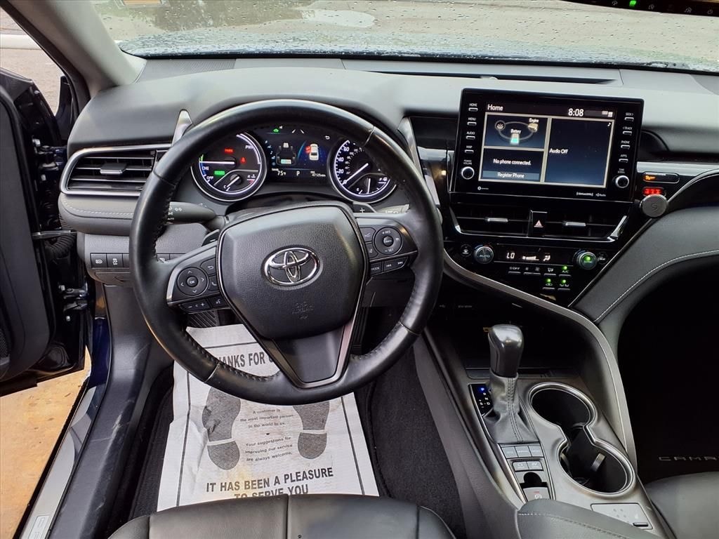 This 2022 Toyota Camry Hybrid XSE in Blue comes with the following features: 2.5L I4 DOHC 16V eCVT FWD 2.5L I4 DOHC 16V 2.5L I4 DOHC 16V, 4-Wheel Disc Brakes, 6 Speakers, ABS brakes, Air Conditioning, Alloy wheels, AM/FM radio: SiriusXM, Apple CarPlay/Android Auto, Auto High-beam Headlights, Auto-dimming Rear-View mirror, Automatic temperature control, Brake assist, Bumpers: body-color, Delay-off headlights, Driver door bin, Driver vanity mirror, Dual front impact airbags, Dual front side impact airbags, Electronic Stability Control, Emergency communication system: Safety Connect with 1-year trial, Exterior Parking Camera Rear, Four wheel independent suspension, Front anti-roll bar, Front Bucket Seats, Front Center Armrest, Front dual zone A/C, Front reading lights, Fully automatic headlights, Garage door transmitter: HomeLink, Heated door mirrors, Heated front seats, Illuminated entry, Knee airbag, Low tire pressure warning, Multi-Stage Heated Front Bucket Seats, Occupant sensing airbag, Outside temperature display, Overhead airbag, Overhead console, Panic alarm, Passenger door bin, Passenger vanity mirror, Perforated Leather Seat Trim, Power door mirrors, Power driver seat, Power passenger seat, Power steering, Power windows, Radio data system, Radio: AM/FM/HD Audio Plus, Rear anti-roll bar, Rear reading lights, Rear seat center armrest, Rear side impact airbag, Rear window defroster, Remote keyless entry, Security system, Speed control, Speed-sensing steering, Split folding rear seat, Spoiler, Steering wheel mounted audio controls, Telescoping steering wheel, Tilt steering wheel, Traction control, Trip computer, Turn signal indicator mirrors, Variably intermittent wipers, and Wheels: 8.0J x 19" Machined Finish Alloy. Blue 2022 Toyota Camry Hybrid XSE FWD eCVT 2.5L I4 DOHC 16V 2.5L I4 DOHC 16V.
